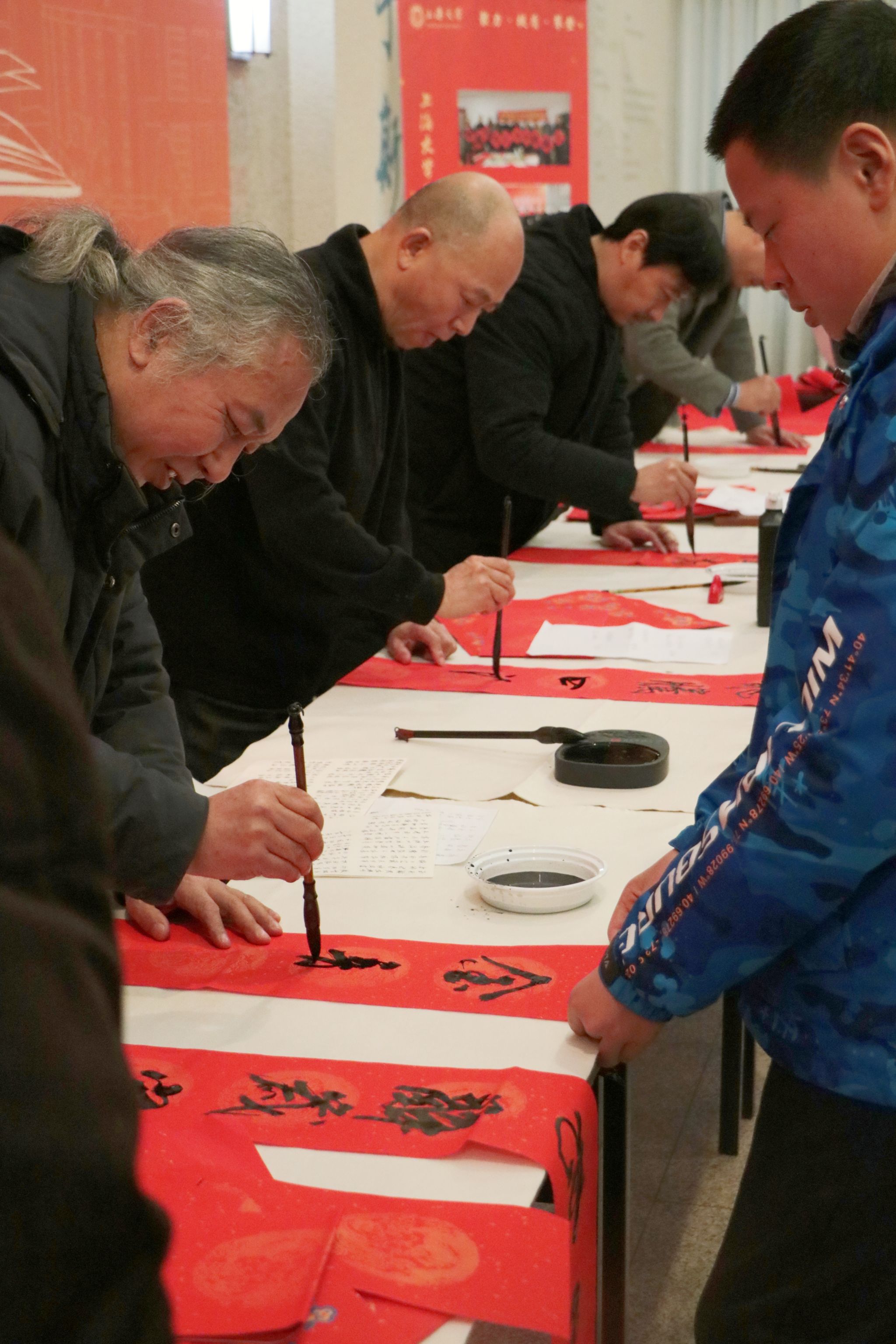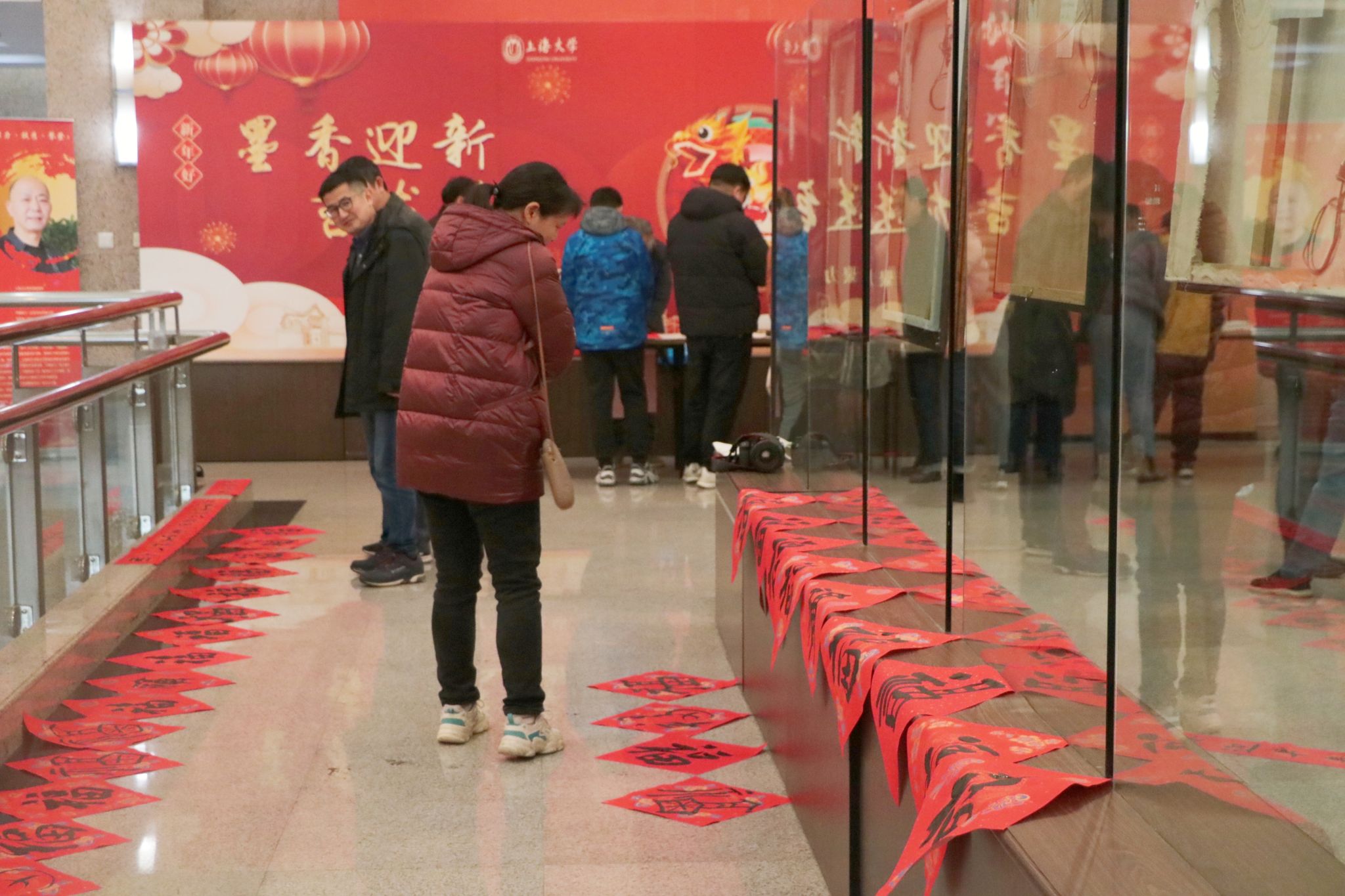 会前,学校图书馆、工会联合党委宣传部,在校本部图书馆二楼展厅举办“墨香迎新、吉龙送福”活动,邀请海派书画家陈志宏与国产亚洲精品美女久久久工会书画协会吴笑、钱楷、曹兴旺三位老师,与广大师生一道挥毫泼墨创作出自己心仪的春联、福字。