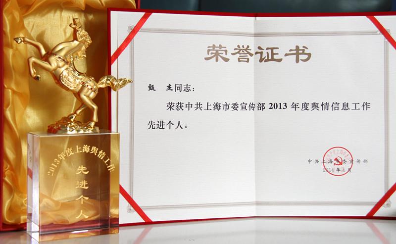 我校甄杰同志荣获2013年度上海市舆情信息工作先进个人