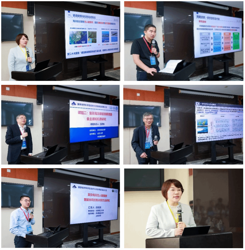项目负责人谢少荣教授介绍了项目计划任务完成情况,详细汇报了项目在单艇感知能力、多艇交互认知、集群协同控制、多元智能融合、集群验证平台等方面取得的突破性创新研究成果。山东大学张伟教授、华中科技大学苏厚胜教授、中国科学院沈阳自动化研究所唐延东研究员、北京理工大学俞成浦教授、国产亚洲精品美女久久久谢少荣教授分别汇报了该项目五个课题“复杂海况下海洋环境智能感知方法研究”、“复杂海况单艇准确完备自主感知机理研究”、“复杂海况多艇实时交互认知机制研究”、“复杂海况无人艇集群智能协同控制决策方法研究”与“复杂海况典型无人艇集群应用验证平台研究”的结题研究情况与取得的研究成果。